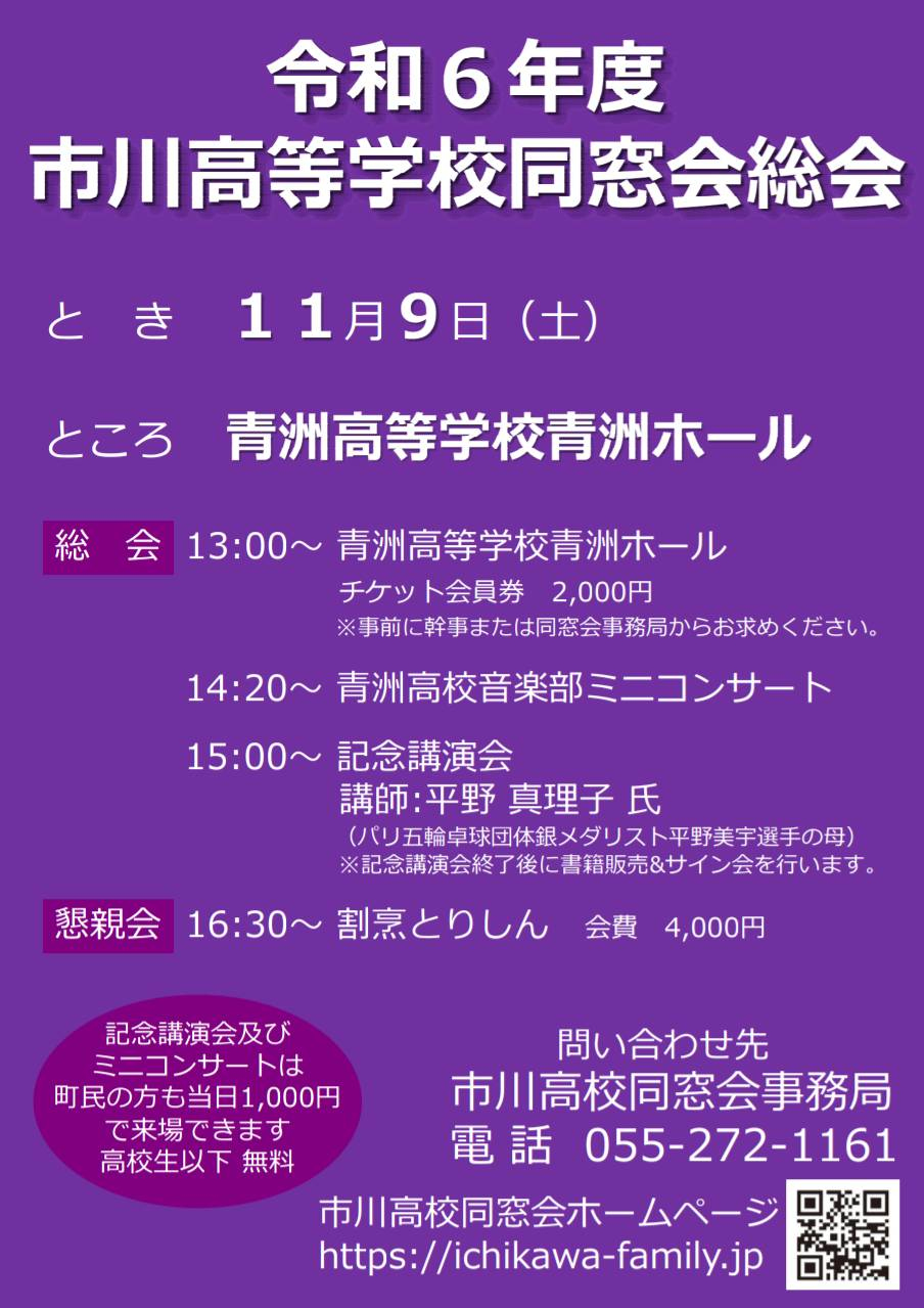 令和6年度総会・懇親会は終了いたしました。ご協力ありがとうございました。山梨県立市川高等学校同窓会 令和6年度総会・懇親会のお知らせ![]() 開催年月日 :令和6年11月9日(土) 受付 :12:30 ~ 13:00 総会 :13:00(会場 青洲高校 青洲ホール、会費 2,000円) 13:00 ~ 13:40 定期総会 13:40 ~ 14:20 校舎見学ツアー 14:20 ~ 15:00 音楽部ミニコンサート 15:00 ~ 15:40 記念講演会 講師:平野真理子氏(パリ五輪卓球団体銀メダリスト平野美宇選手の母) 懇親会 :16:30 ~ 18:00(会場 割烹とりしん、会費 4,000円[当日会場徴収]) 同窓会チケット(2,000円)のお求めは当番幹事(平成元年卒) または市川高校同窓会事務局(青洲高校 砂田 [TEL.055-272-1161、メール])まで 記念品としてクリアファイルをお渡しします。(数に限りがあります。) その他 ・チケット(会員券)の購入とともに記念品を受領しましたら、お手数でも記念品引換券に必要事項をご記入ください。 ・ご不明の点がございましたら同窓会事務局までご連絡ください。 ・駐車場は、青洲高校職員駐車場、JA山梨みらい市川支店駐車場をご利用ください。 市川高校同窓会Facebookはこちら 市川高校同窓会Xはこちら 市川高校同窓会YouTubeはこちら |